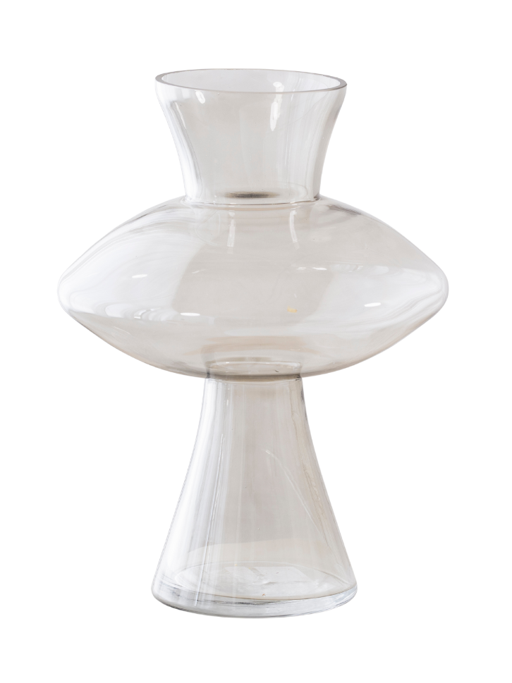 The Tamni Oblak vase is crafted from clear, sculptural glass and shaped with an airy, floating silhouette reminiscent of a drifting cloud. Its soft curves and mid-century-inspired form add lightness and quiet sophistication to any setting.